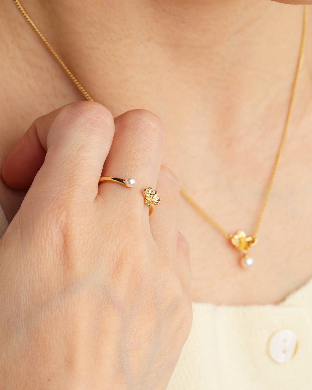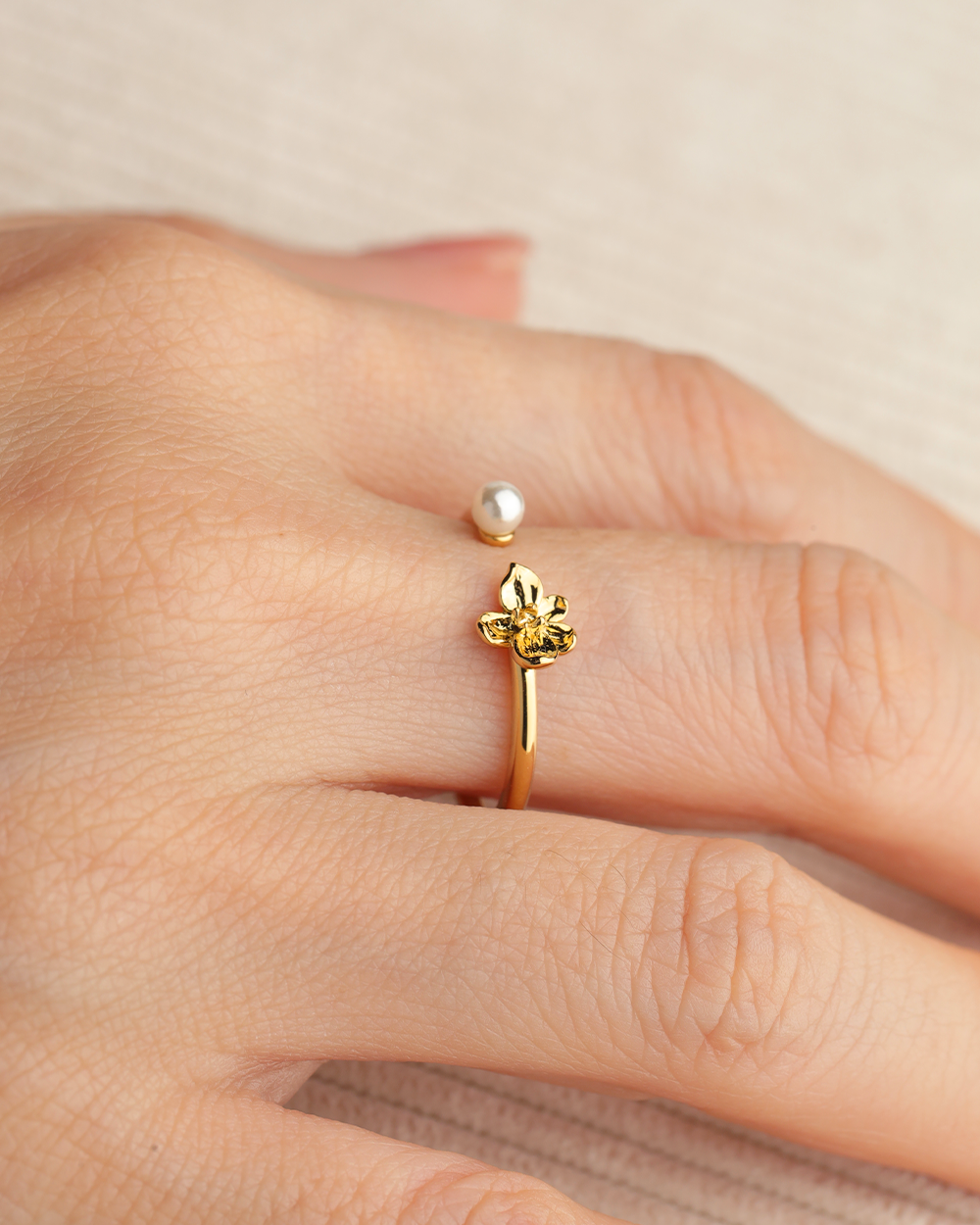 The�Cathy Gold Ring features a delicate orchid-inspired design. A single, shell pearl accents the floral motif, adding a touch of natural elegance. This ring offers a subtle yet sophisticated way to embrace botanical beauty.
